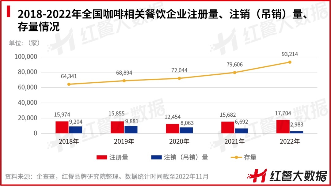 咖啡赛道的火热也吸引了不少创业者。据企查查数据,截至2022年11月,咖啡相关的餐饮企业注册量达到1.77万家,已经超过了去年全年的注册量,存续量也大幅上升,同期的咖啡相关餐饮企业净增长量达到了1.36万家。