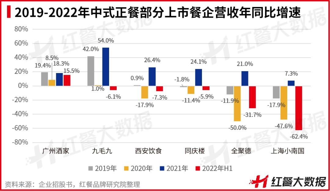 在2019年之前,中式正餐已出现增长乏力的苗头。而近年来,在疫情的冲击之下,中式正餐更是发展得步履蹒跚。从上市中式正餐企业看,除了少数餐企(如业务重心转移至食品板块的广州酒家、通过副牌发力多个品类的九毛九等)较为成功地找到企业第二增长曲线外,其余上市餐企的营收增幅都不太乐观。