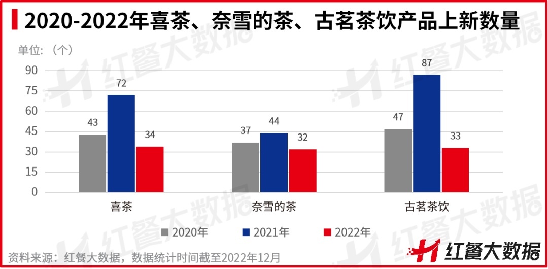 据《2022中国饮品行业产品报告》,2020年喜茶上新43款新品、奈雪的茶上新37款新品、古茗上新47款新品,而到了2021年,上述三个品牌的上新数字变为72、44、87。据红餐品牌研究院统计,截至2022年12月,喜茶、奈雪、古茗在今年月的上新数量分别是34、32、33,相比2021年均有不同程度下滑。