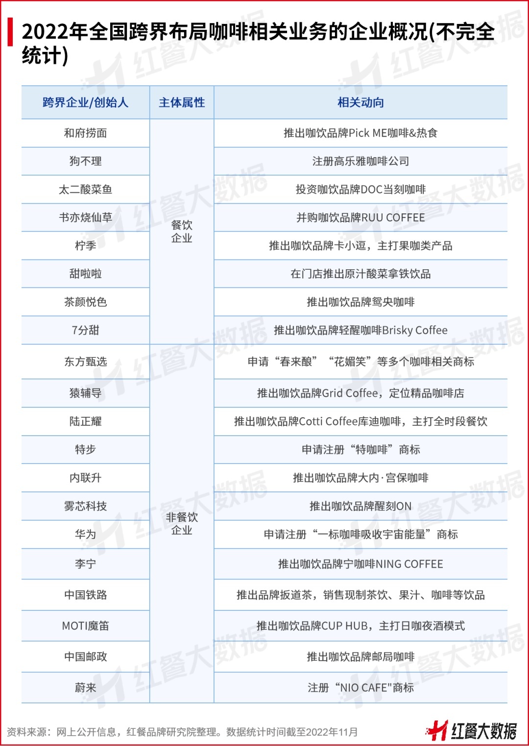 同时,据红餐品牌研究院统计,截至2022年11月,推出新品牌、注册咖啡相关商标、新增咖啡相关业务等动向的跨界品牌有20个。总体来看,这些跨界企业可以大致分成两大类。