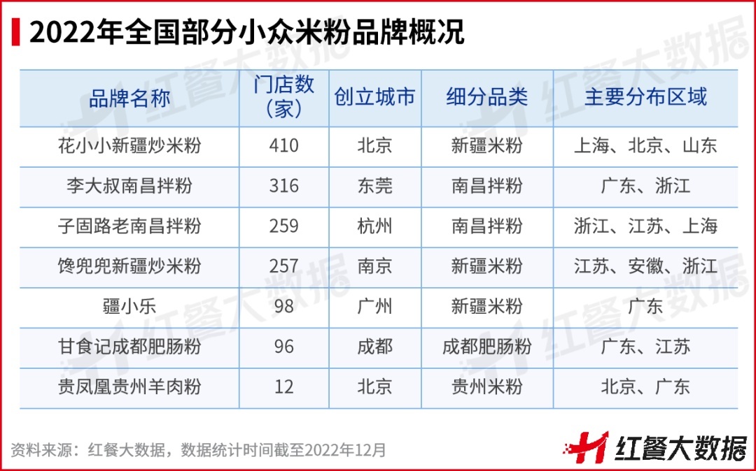 比如在新疆炒米粉赛道快速出圈的花小小,其第一家店于2020年4月开业,目前已经在全国30多个地市开出了390余家门店,是近年来小众米粉细分赛道里门店增长最快的品牌。另一个代表品牌子固路老南昌拌粉,创立初期门店增长十分缓慢,但从去年开始也进入了快速扩张阶段,目前共有近280家门店,其中超过90%的门店都是在2021年新开出的。