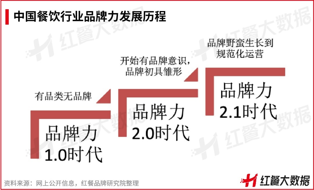 在餐饮品牌力1.0时代,餐饮市场整体处于“有品类无品牌”的状态,餐厅是微型的“前店后厂”,以夫妻店模式为主;进入到餐饮品牌力2.0时代,餐企开始萌生品牌意识,品牌力初具雏形,并且部分餐饮品牌开始了后端标准化和前端规模化的运营探索;伴随着餐饮连锁化和标准化的加深,品牌由野蛮生长开始进入规范化运营,涌现出了诸多优秀的品牌,品牌力进入到2.1时代。
