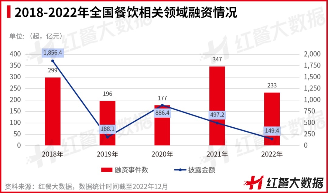 据红餐大数据,截至2022年12月,全国餐饮领域的融资案例为233起,披露的融资金额为149亿元,都出现一定的降幅。