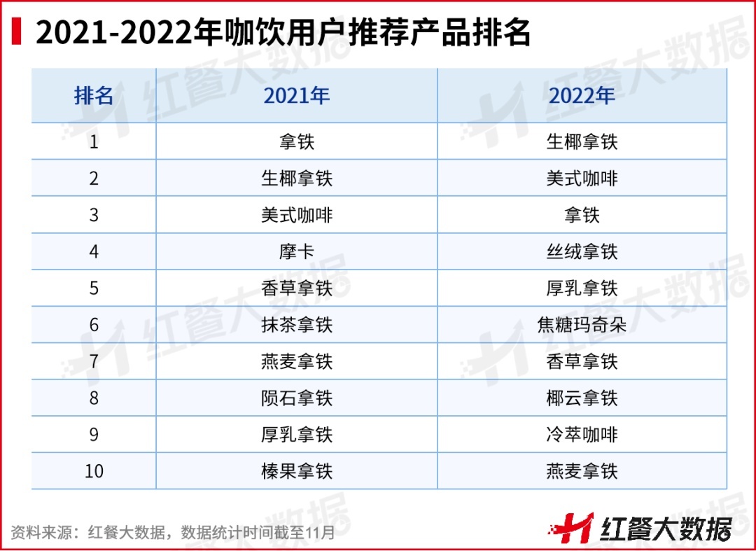 在产品上,咖饮产品不断迭代升级,紧跟茶饮产品创新的步伐,口味越来越多元化,衍生出奶咖、果咖、茶咖以及各种特调咖饮产品。红餐大数据显示,在2021-2022年消费者推荐最多的10款咖饮产品中,拿铁类咖饮占据统领地位,其他经典口味产品譬如美式咖啡、摩卡等则排名靠后。