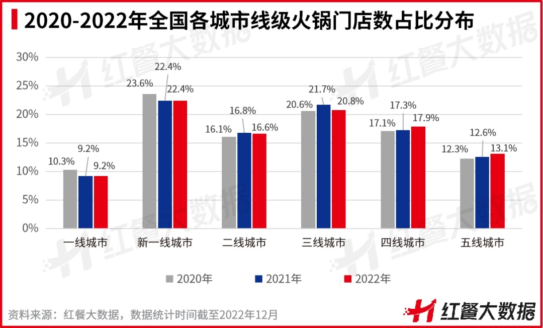 红餐大数据显示,相比前两年,火锅城市下沉趋势比较明显。从2020-2022年这三年的门店数占比来看,三线及以下城市的火锅门店数占比均有所提升,而一线和新一线城市门店数占比则有不同程度下滑。