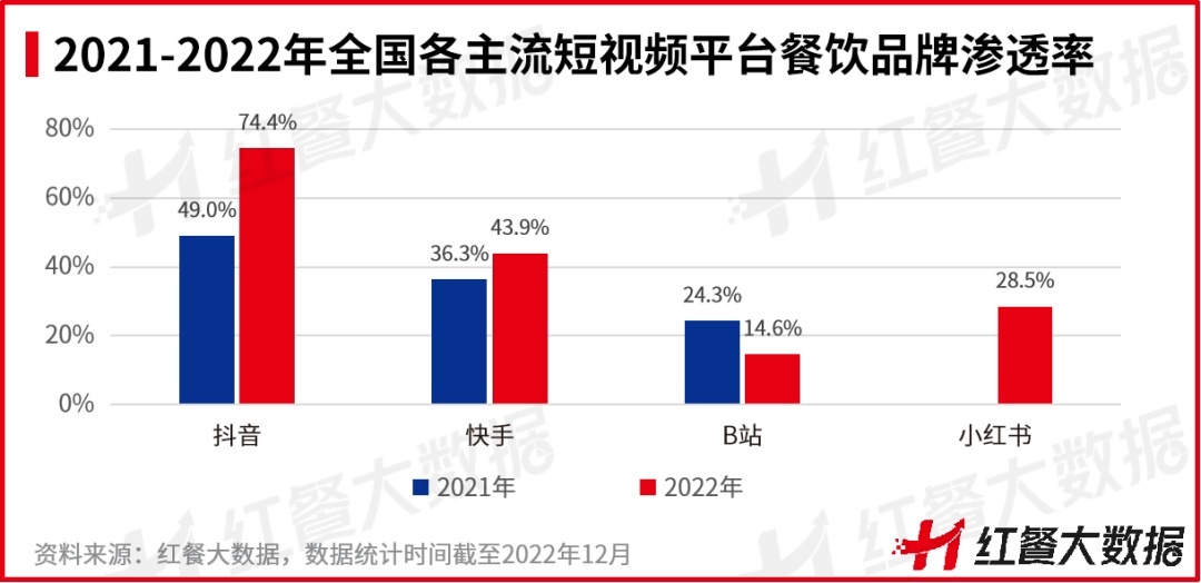 据红餐大数据,各餐饮品类在这些视频平台上的渗透情况分布并不平均。随着抖音和快手在这两年对本地生活服务投入的加大,餐饮品牌在这两个平台的渗透率也明显上升。餐饮品牌在快手上的渗透率增至43.9%,而在抖音上渗透率高达74.4%,但餐饮品牌在B站上的露出就相对少了很多,渗透率也有所下降。