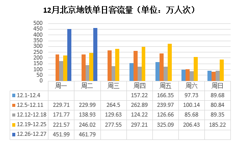 从单日数据看,12月5日(周一)、12月11日(周日)、12月26日(周一)是北京地铁客流量的几个重要时间点。经历了增长、减少、再增长的过程。
