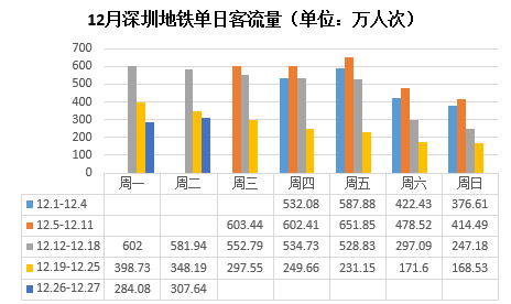 12月12日至25日的两周,深圳地铁经历了持续下跌,从最高时六百余万跌到一百余万。比如12月12日周一的人次为602万,12月19 周一则跌到了 398.73万;12月18日周日为 247.18万人次,12月25日周日为168.53万人次。