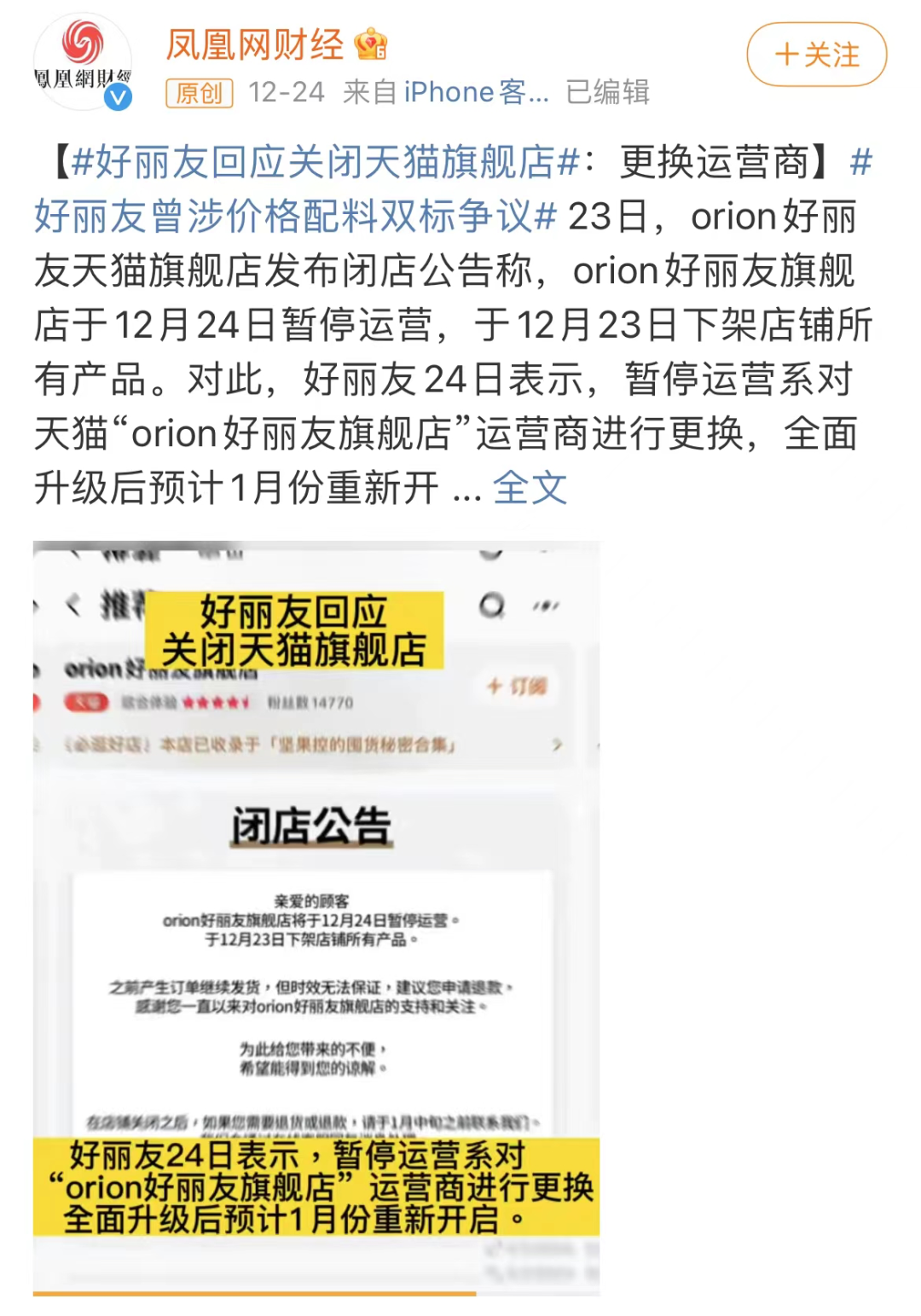双十二期间还在积极营销搞活动的好丽友,突然在12月24日宣布天猫旗舰店闭店。并宣布:在此之前生产订单继续发货,但时效无法保证,建议消费者退款;如有退款需求,请于1月中旬之前联系客服。