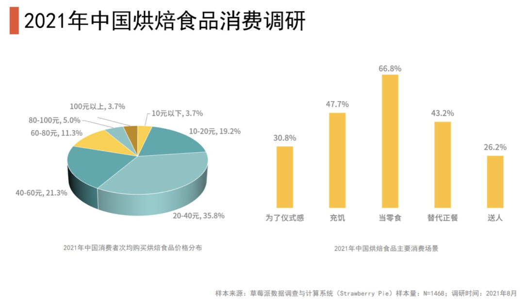 此外,艾媒咨询在《2021年中国烘焙食品行业竞争格局与消费行为分析报告》中指出:2021年中国烘焙行业市场规模达2600.8亿元,同比增长19.9%。2023年预计将突破3000亿元。且在烘焙的各种消费场景中,66.8%的消费者将其当作零食;作为充饥和正餐替代品则位居第二,占比达47.7%。