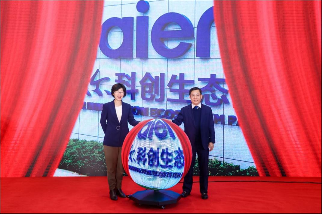 现场,海尔集团董事局副主席、执行副总裁谭丽霞与海尔集团高级副总裁、海尔智家董事长兼总裁李华刚为海尔科创生态园的启用揭牌。