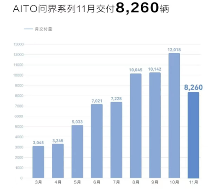公开资料显示,问界于今年3月开启交付,9个月累计销量超6.6万。10月份更是以12018辆的月销量超过蔚来和理想,跻身造车新势力,仅次于哪吒汽车。