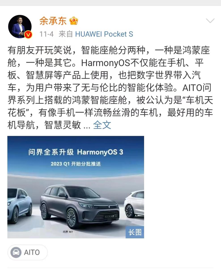 “开足马力卖,明年争取年销超过30万辆,30万辆超过所有对手。”“第一年干翻特斯拉,第二年把BBA的空间一把干掉”“未来智能座舱分为两种,一种是鸿蒙,另一种是others”。……这么狂的口气,不用想一定是出自余承东的嘴。