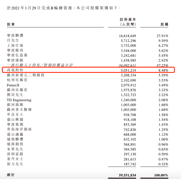 在康沣生物上市前的股东架构中,除了创始管理团队外,高瓴通过高瓴钧恒持股8.48%,为其第一大机构投资人。