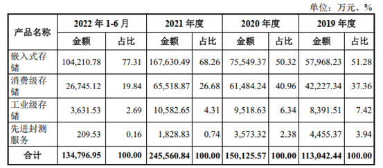 从收入结构来看,2022年上半年,嵌入式存储、消费级存储、工业级存储、先进封测服务分别实现10.42亿元、2.67亿元、3631.53万元、209.53万元,嵌入式存储和消费级存储是其最主要的业务,2020-2022年上半年,这两项业务占总营收的比重均保持在9成以上,而这两项业务的下游近年来进入了下行周期。