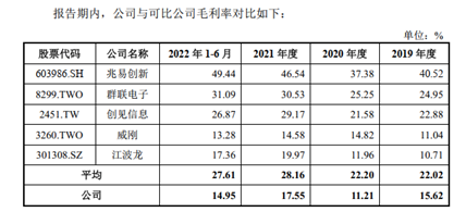 2019-2022年上半年,佰维存储的毛利率水平分别为15.62%、11.21%、17.55%、14.95%,而同期同行可比公司毛利率平均值分别为22.02% 、22.2% 、28.16%、27.61%。
