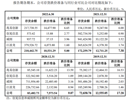 庞大的存货导致佰维存储面临较大的存货跌价风险。2019-2022年上半年,佰维存储的存货跌价准备分别为 1.26亿元、 7,573.54 万元、1.27亿元和 1.05亿元,存货跌价准备计提比例分别为 17.28%、 9.07%、7.38%和 5.00%。