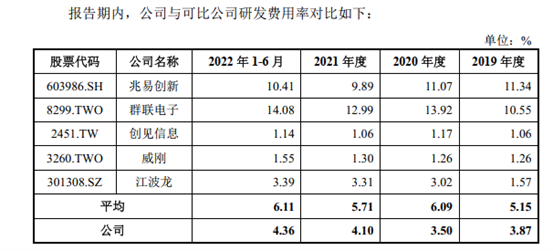 另一个判断发展是否是高质量的指标是研发。2019-2022年上半年,佰维存储的研发费用分别为4536.00万元、5752.31万元和1.07亿元、6040万元,研发费用率分别为3.87%、3.50%、4.10%、4.36%,远低于行业6%左右的研发费用率。