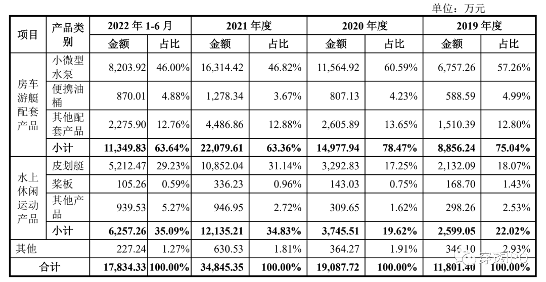 虽然公司名称直接变更为“户外用品”,但实际渡远户外的核心产品既不是比较常见的帐篷、背包、睡袋、雪杖、防风衣裤、指北针等户外装备,也不是房车、游艇、滑翔伞这类大型户外器具,多年来其核心产品都是房车游艇常用的小微型水磅、便携式油桶等配套产品,以及皮划艇等水上休闲运动产品。