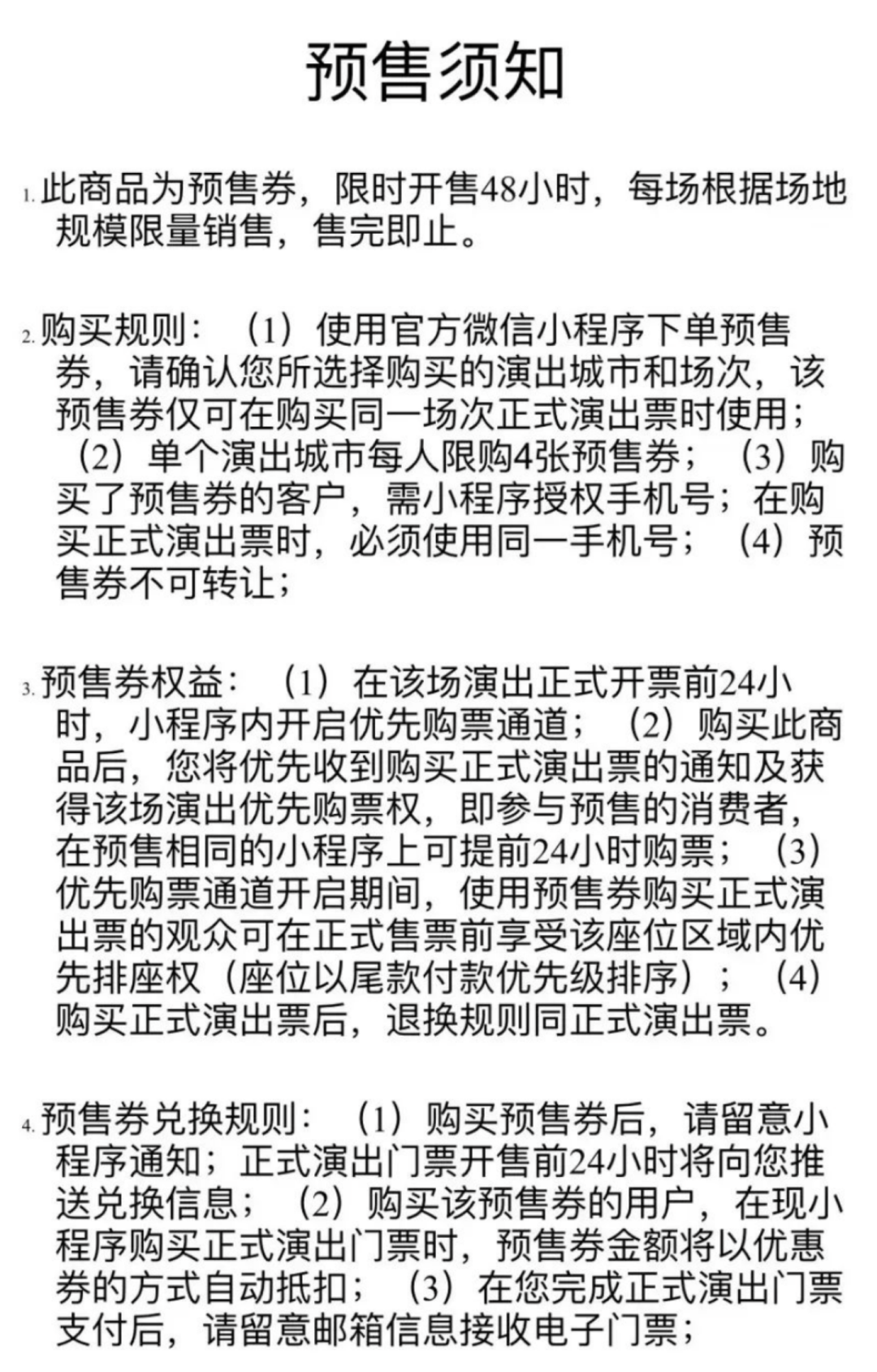 河豚君梳理目前曝光的信息发现,预售券的发售方为"海聚微盟",《预售须知》声明,每人限购4张预售券,持券可提前24小时购票,以付尾款的顺序优先安排座位,正式门票也需要在小程序上完成支付,若未及时兑付权益,券款可以退还。