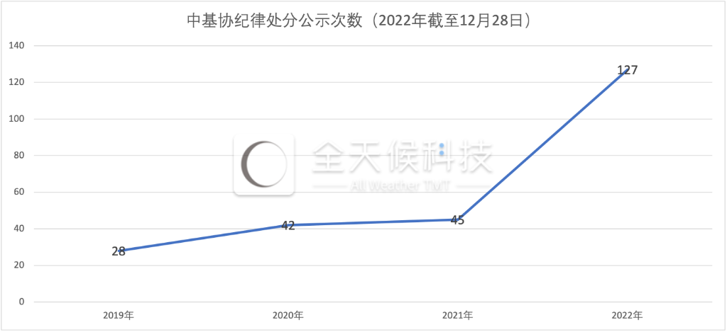 与往年相比,2022年的行业纪律处分频次增长趋势也当得起“井喷”一词,2022年(截至12月28日)中基协网站上对机构、人员纪律处分的相关公示次数达到了127起,超过了2019—2021年的总和。