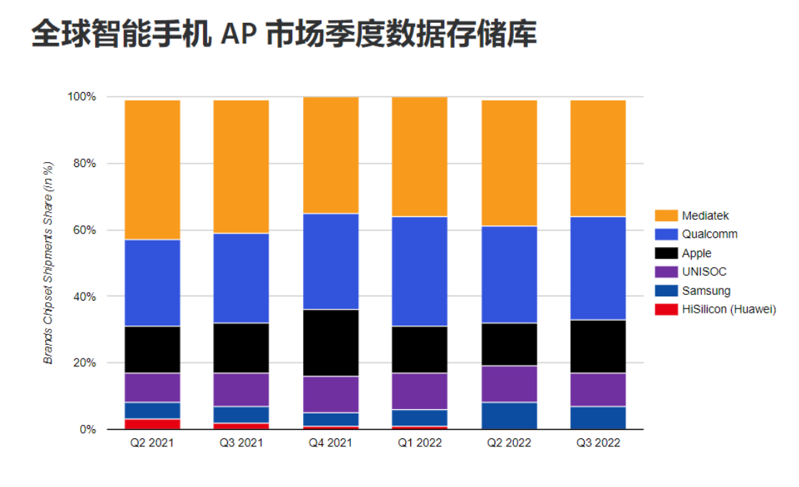 来自知名数据机构Counterpoint的报告显示,今年三季度联发科位居全球智能手机AP市场占有率榜首,份额为35%,高通则录得31%,接下来依次是苹果、展锐和三星。但如果将目光收窄到中低端市场,联发科的占有率仍超过半数,高通则徘徊在20%左右。