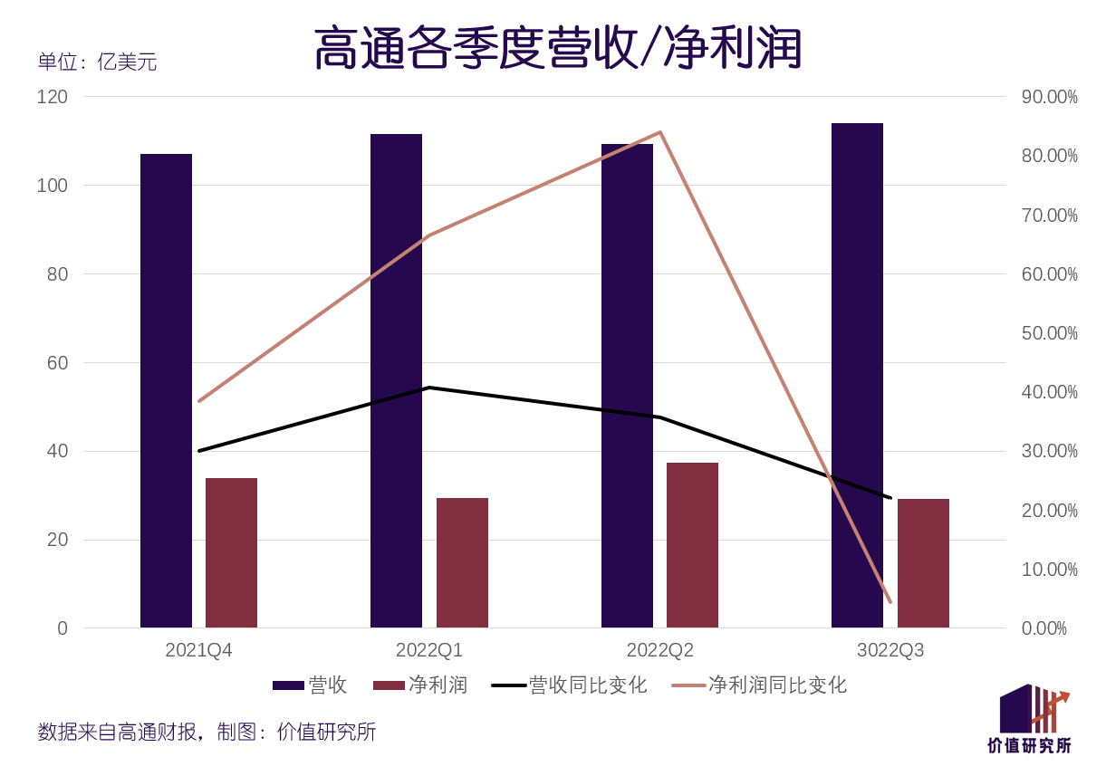 根据历史数据,过去四个季度高通营收分别为107.05亿、111.64亿、109.36亿和113.96亿美元,对应的同比增速分别录得29.99%、40.69%、35.68%和22.07%。刚刚过去的三季度(按自然年划分),是高通今年表现最差的一个季度,营收增速也出现了两连跌。