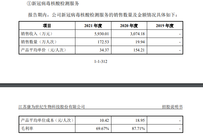 据康为世纪披露,2020年、2021年,公司新冠病毒核酸检测服务销售收入分别为3074.18万元、5930.01万元,销售数量19.94万人次、172.53万人次,产品平均单价为154.21元/人次、34.37元/人次。数据显示,截至2021年末,康为世纪在境外也上市了3款新冠病毒核酸检测试剂盒,2020年、2021年分别形成收入87.38万元和1143.04万元。