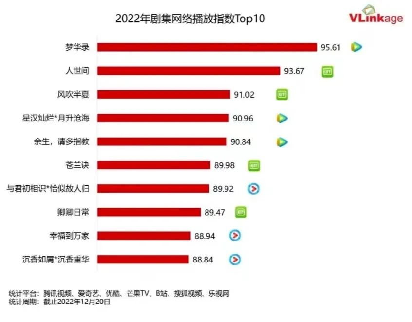 2022年Vlinkage网剧播放指数TOP10榜单中,上榜作品新媒体指数均在88+,指数最高的剧集为《梦华录》,以95.61的播放指数领跑V榜年度榜单。豆瓣电影的年度高分国产剧榜单显示,《梦华录》位于豆瓣 2022评分最高华语剧集TOP10,豆瓣开分8.3分,最高达8.8 分。
