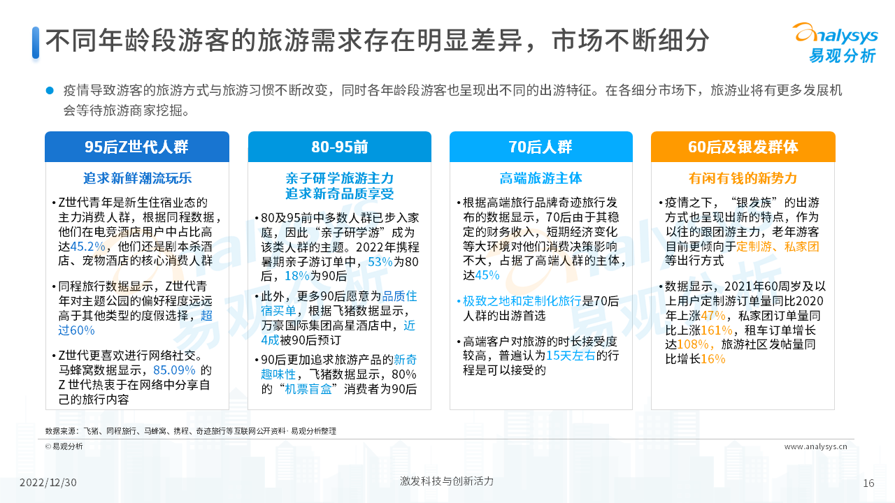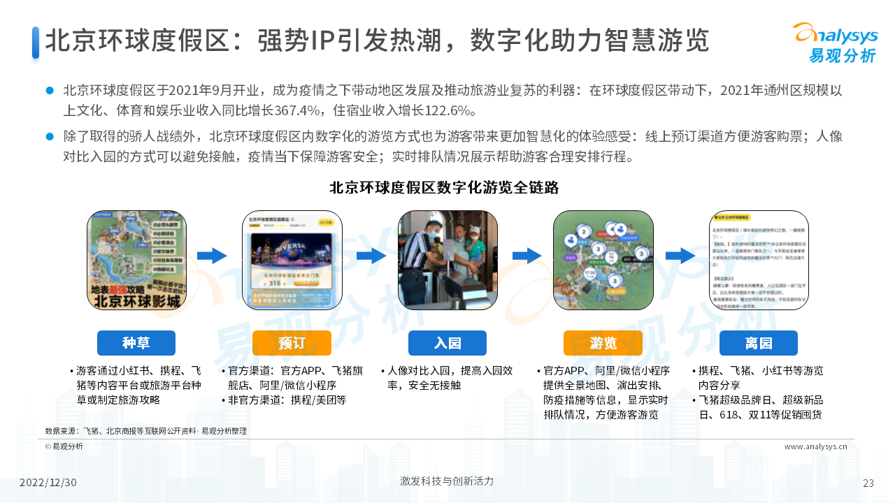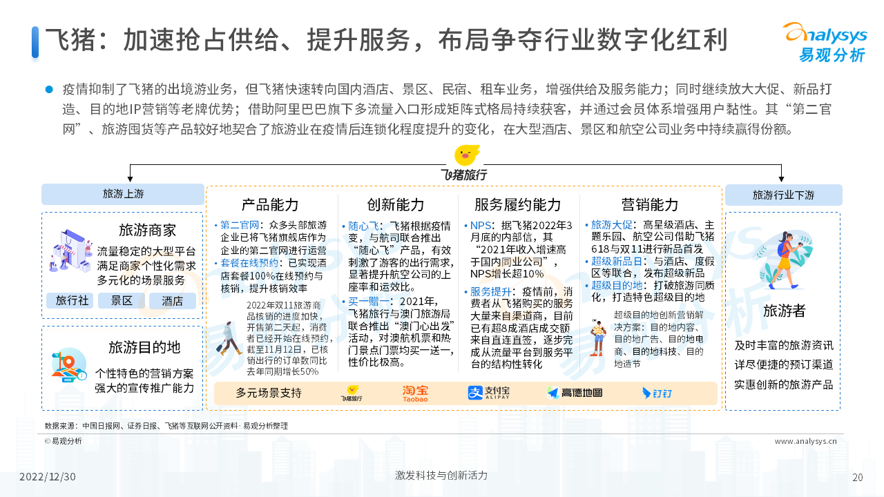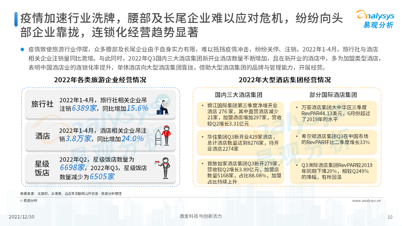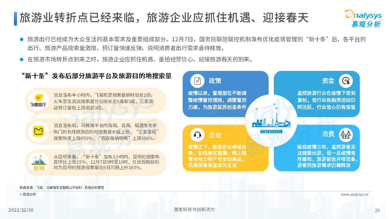 2022年,中国疫情进入常态化防控阶段,中国政府根据疫情的变化,适时调整了旅游管理政策,为旅游业复苏创造条件。2022年底,随着疫情防控“新十条”的出台,旅游业逐步进入恢复阶段。疫情的发生使得旅游业出现了前所未有的变化:旅游者对旅游的消费需求仍在,旅游囤货行为热度攀升;流量多元化与泛生活化成为很多旅游平台的发展趋势;疫情加速行业洗牌,腰部及长尾企业纷纷向头部企业靠拢,连锁化经营趋势显著;旅游中间商竞争格局逐渐清晰,携程系、美团、飞猪三分天下的趋势;众多内容平台也期待分享旅游市场。长期来看,投资者长期仍看好旅游行业发展,旅游业虽遭到重创,但转折点已经来临,旅游企业应抓住机遇、迎接春天。