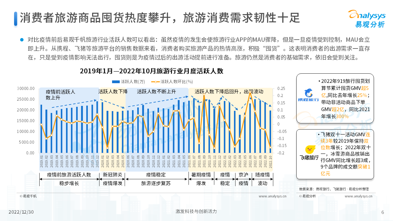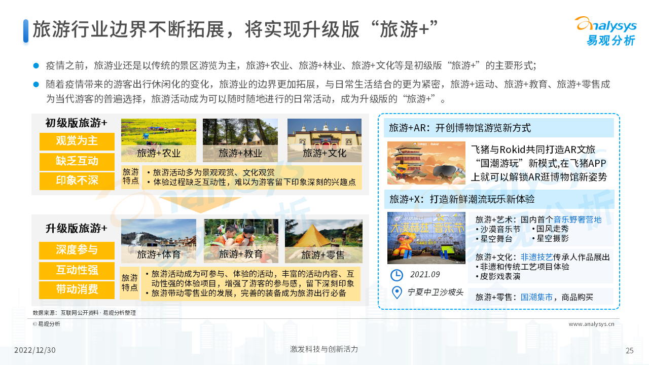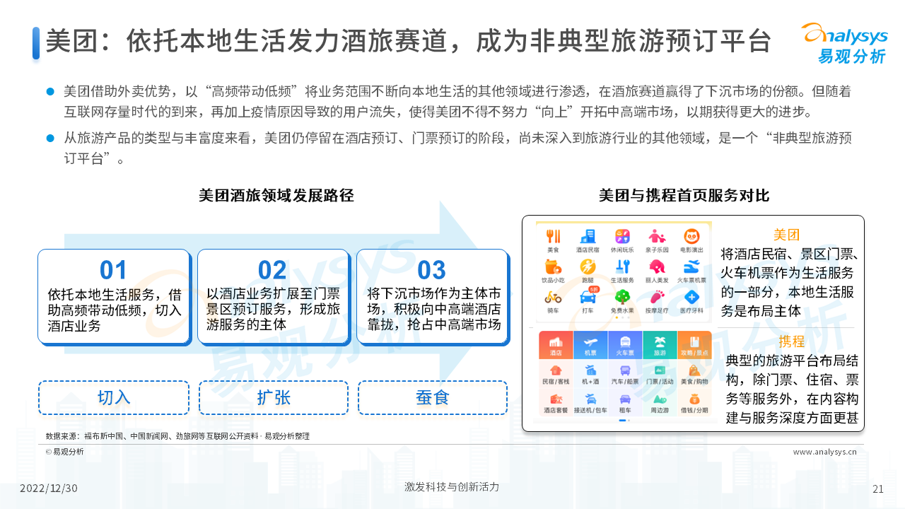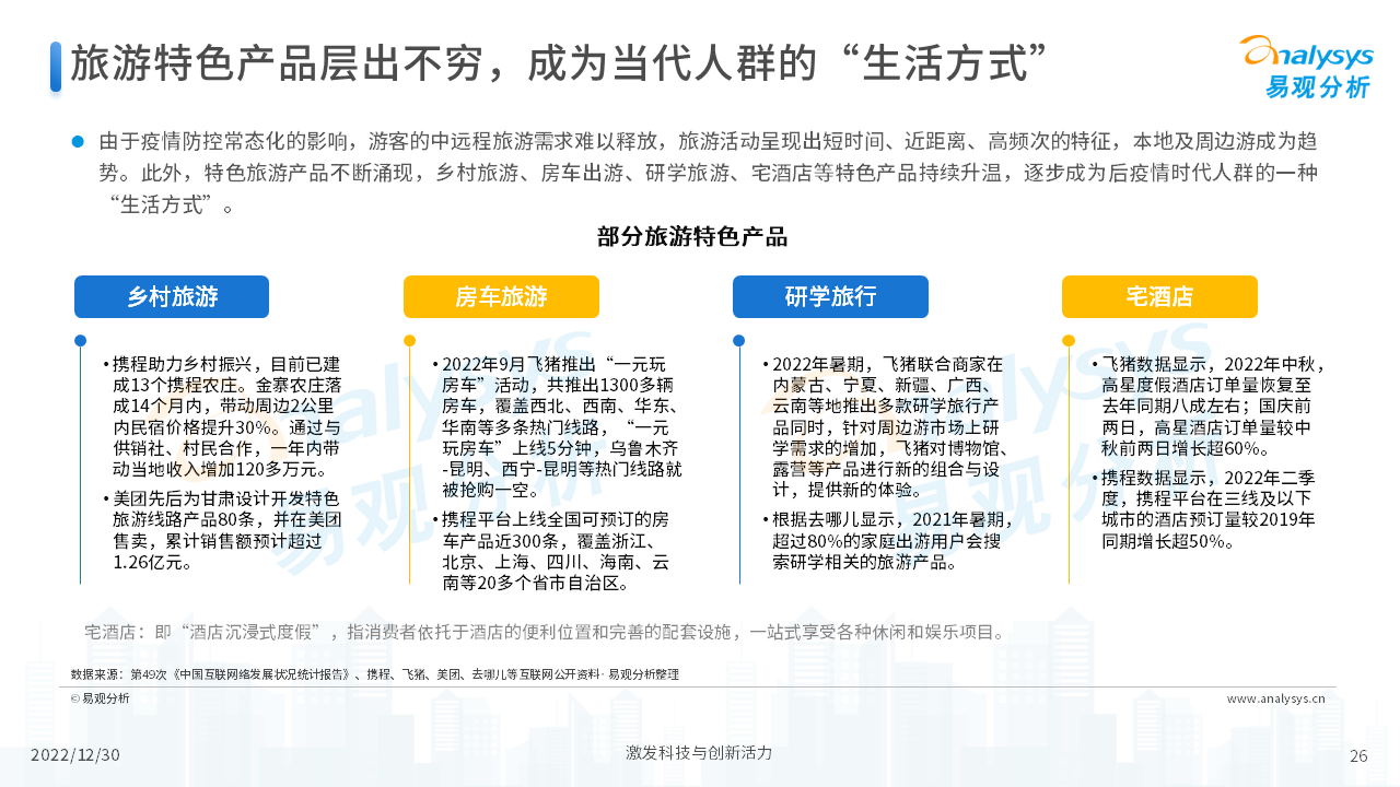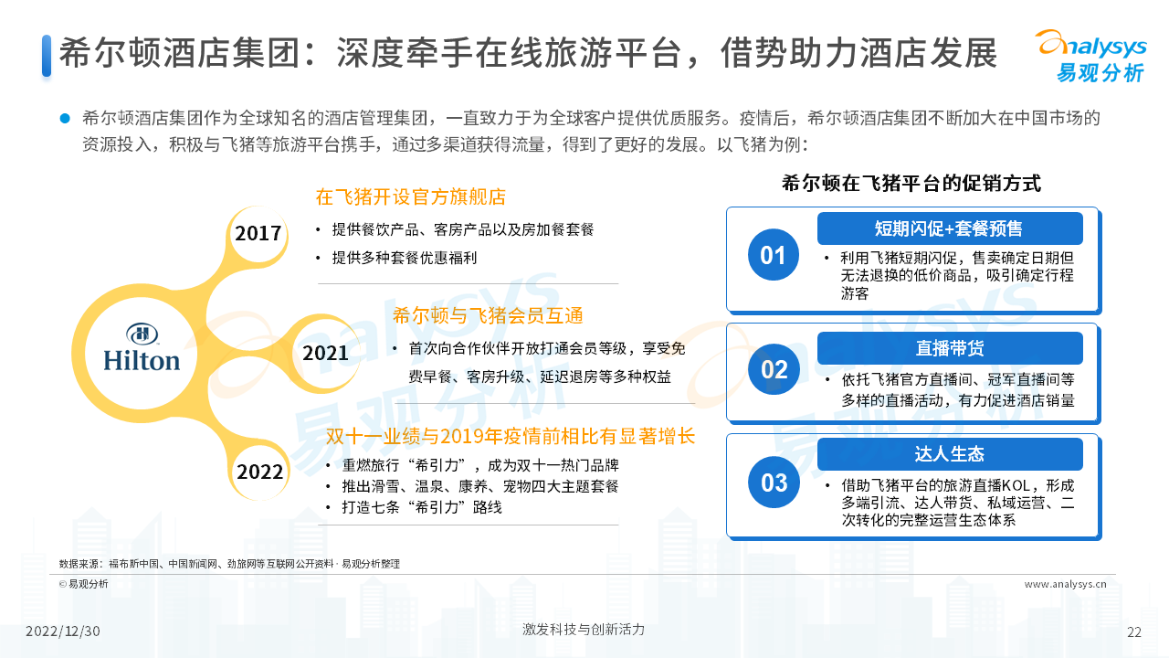 2022年,中国疫情进入常态化防控阶段,中国政府根据疫情的变化,适时调整了旅游管理政策,为旅游业复苏创造条件。2022年底,随着疫情防控“新十条”的出台,旅游业逐步进入恢复阶段。疫情的发生使得旅游业出现了前所未有的变化:旅游者对旅游的消费需求仍在,旅游囤货行为热度攀升;流量多元化与泛生活化成为很多旅游平台的发展趋势;疫情加速行业洗牌,腰部及长尾企业纷纷向头部企业靠拢,连锁化经营趋势显著;旅游中间商竞争格局逐渐清晰,携程系、美团、飞猪三分天下的趋势;众多内容平台也期待分享旅游市场。长期来看,投资者长期仍看好旅游行业发展,旅游业虽遭到重创,但转折点已经来临,旅游企业应抓住机遇、迎接春天。