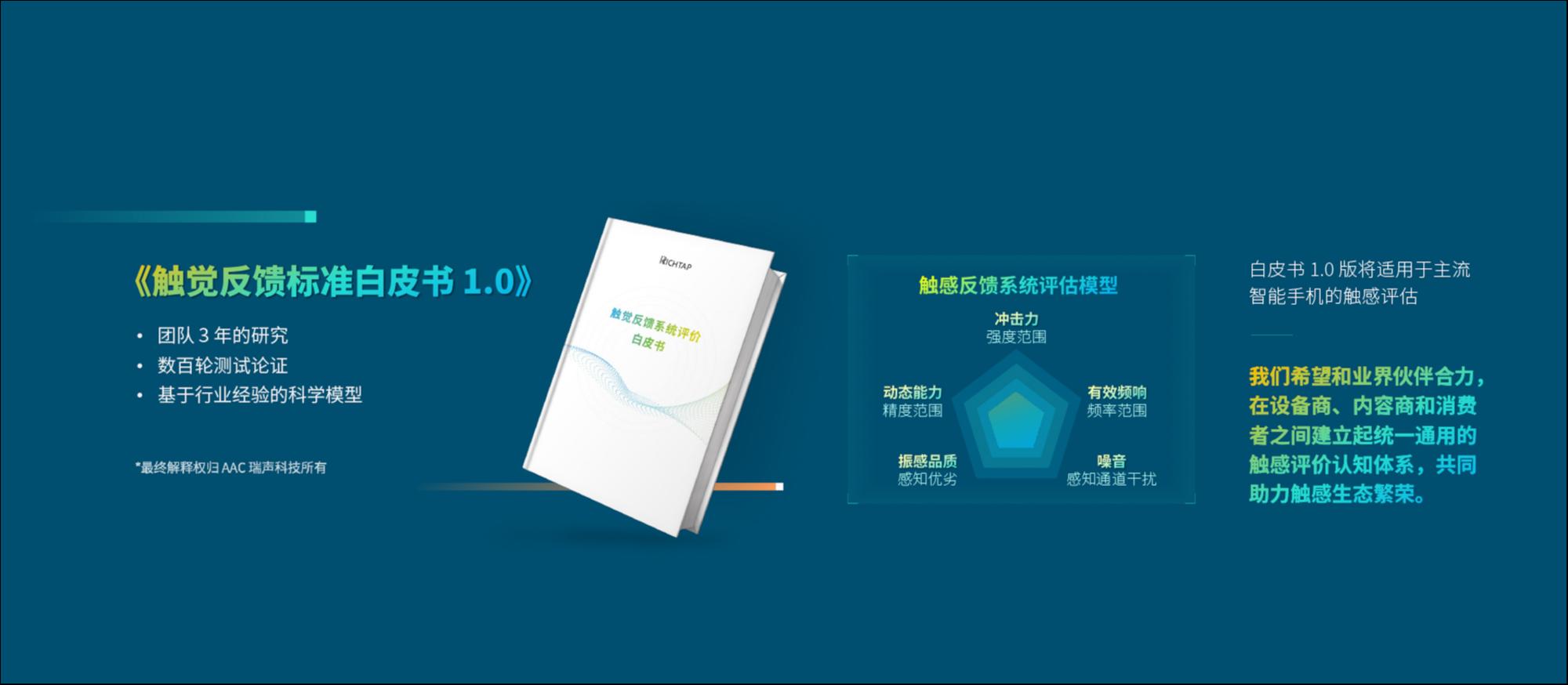 另外,对于目前触觉反馈行业存在触感优劣程度难以对比量化,智能手机振动强弱性能和振动品质优劣难以评定的市场痛点,AAC瑞声科技还带来了《触觉反馈系统评价白皮书1.0》,从三大类指标,6小类指标全方位评估主流智能手机。