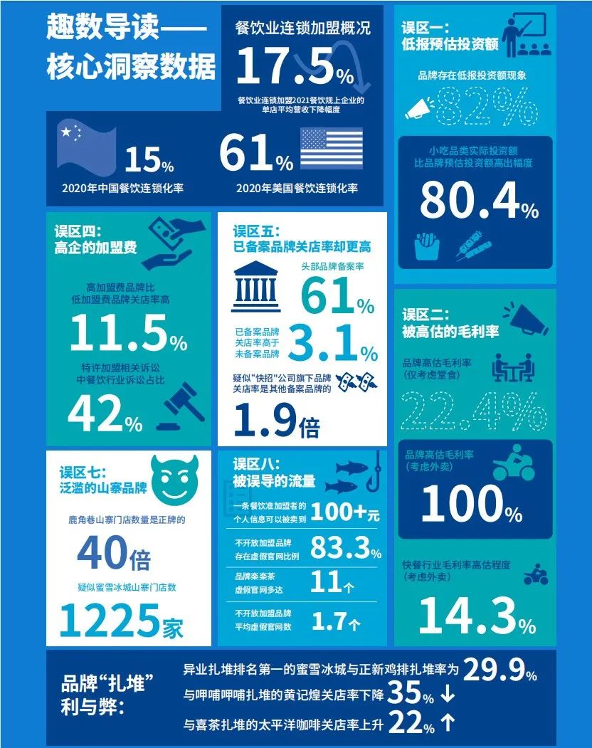懂加盟网与复旦大学管理学院孙金云教授团队通过对1004个餐饮品牌、461311家餐饮门店的经营信息进行梳理、比较和交叉分析之后发现,在餐饮加盟模式中,共存在八个常见的误区: