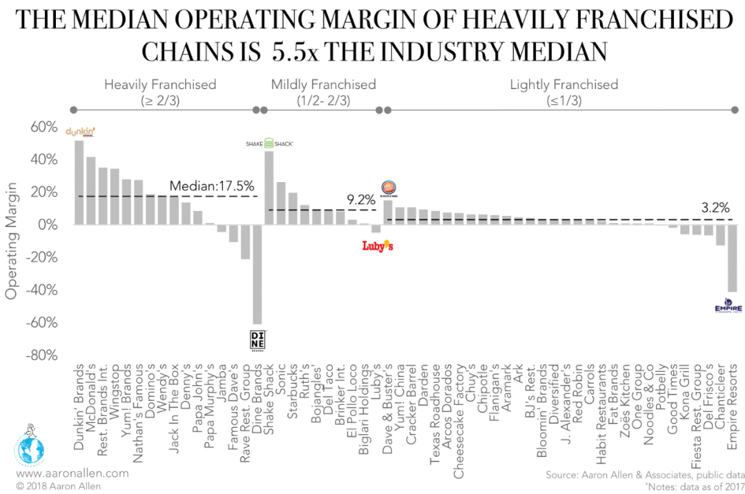 美国餐饮咨询公司Aaron Allen & Associates做的一项研究显示,随着加盟连锁化率的提高,营业利润率也随之增长。