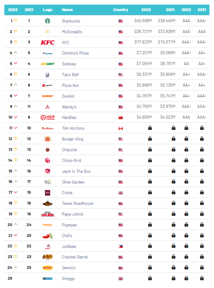 从英国品牌评估机构BrandFinance发布的2022年全球最有价值25家餐厅品牌榜单可以看到,20家都是美国的餐饮品牌,且基本都是像麦当劳、赛百味等以连锁、加盟为主的品牌。
