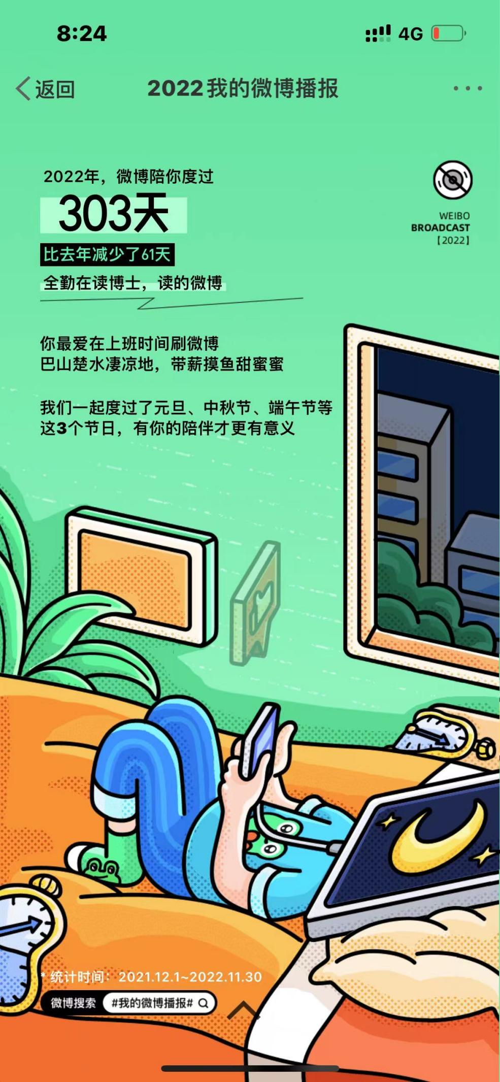 社交媒体类:以微博为主要代表,报告做了一个全年统计数据,包括刷微博时间、度过的特殊节日、经历的微博大事件(如冬奥会、世界杯等)、最爱的用的高频词和Emoji。作为社交媒体,互动数据自然必不可少,微博报告了阅读微博最高的博主和保持互动最多的网友,并且可以一键发送微博@他们。报告的后半部分是习惯报告,发博数最多的一天、熬夜刷博的天数、收藏的微博数量。