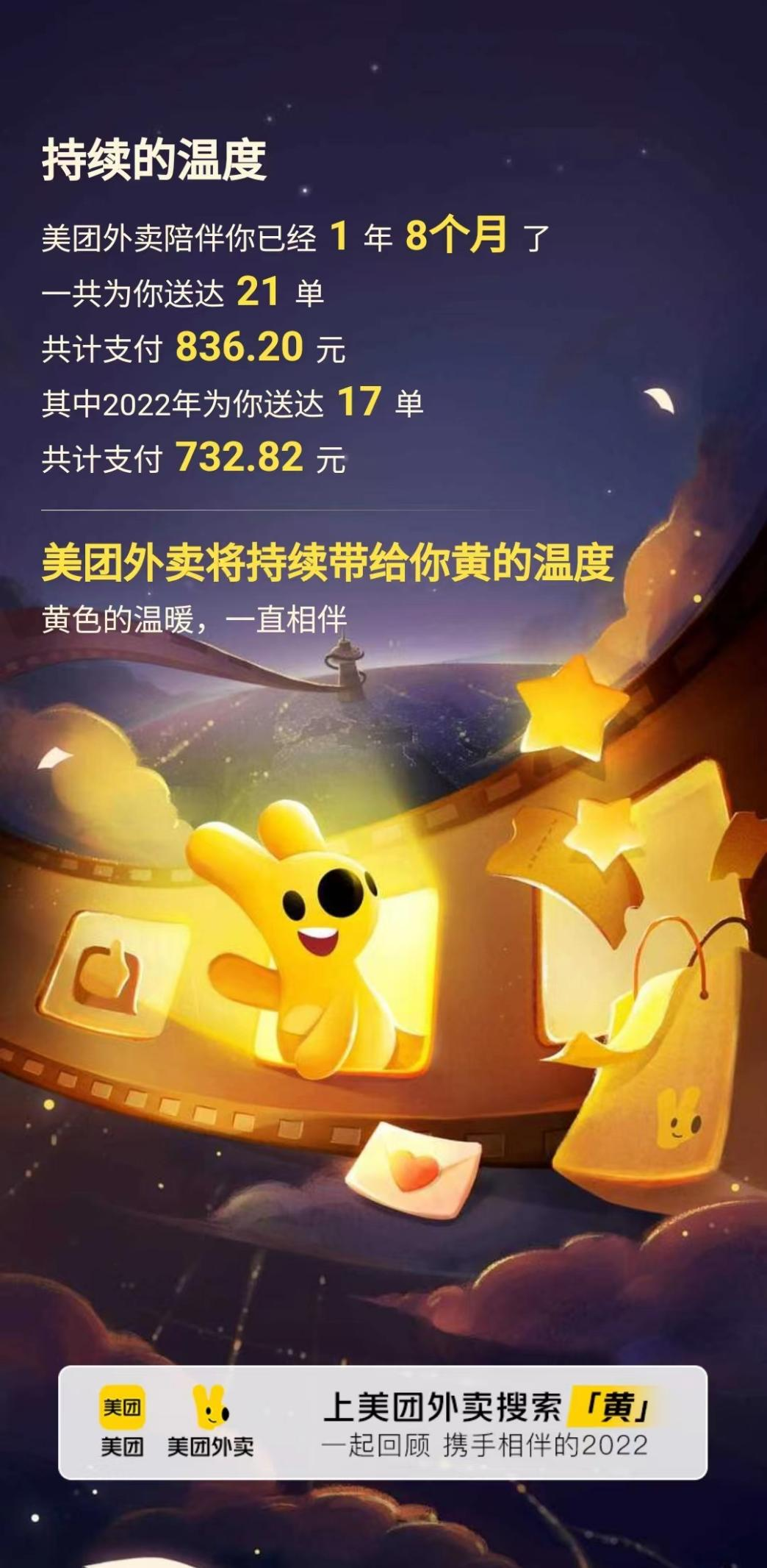 生活类:以美团、高德地图为代表。美团联合美团外卖以“黄的温度”为主题,以“食物的温度、陪伴的温度、礼物的温度、贴心的温度、回忆的温度、不变的温度、持续的温度”等维度,生成涵盖用户订餐次数、常用地址、购买的礼物、喜爱的事物、年度消费等报告。高德地图以“出行日历”为主题,生产用户搜索次数、出行最远的地区、深夜到达的地方、经常出现的地区,还报告了低碳出行次数,这是今年的亮点。