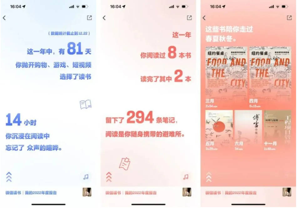 其一,在时间节点上,年末具有特殊的含义。它代表我们可以通过一个特殊的仪式,回忆这一年的点点滴滴,记录某一个精彩感动的瞬间,与旧年告别迎接新年的到来。从这个意义上看,年度报告刷屏折射出:仪式感是用户的刚需。知乎网友@面包的感想或许说出了许多人的心声:“在大混乱的2022年,我感觉秩序中、规划中的我不断被打碎,时刻以一种无准备的姿态面对着生活中的种种挑战。看见年度报告,有很多时刻觉得自己真的无法解决眼前的问题,但最终竟然也一路摸爬滚地来到2022年的年终。”