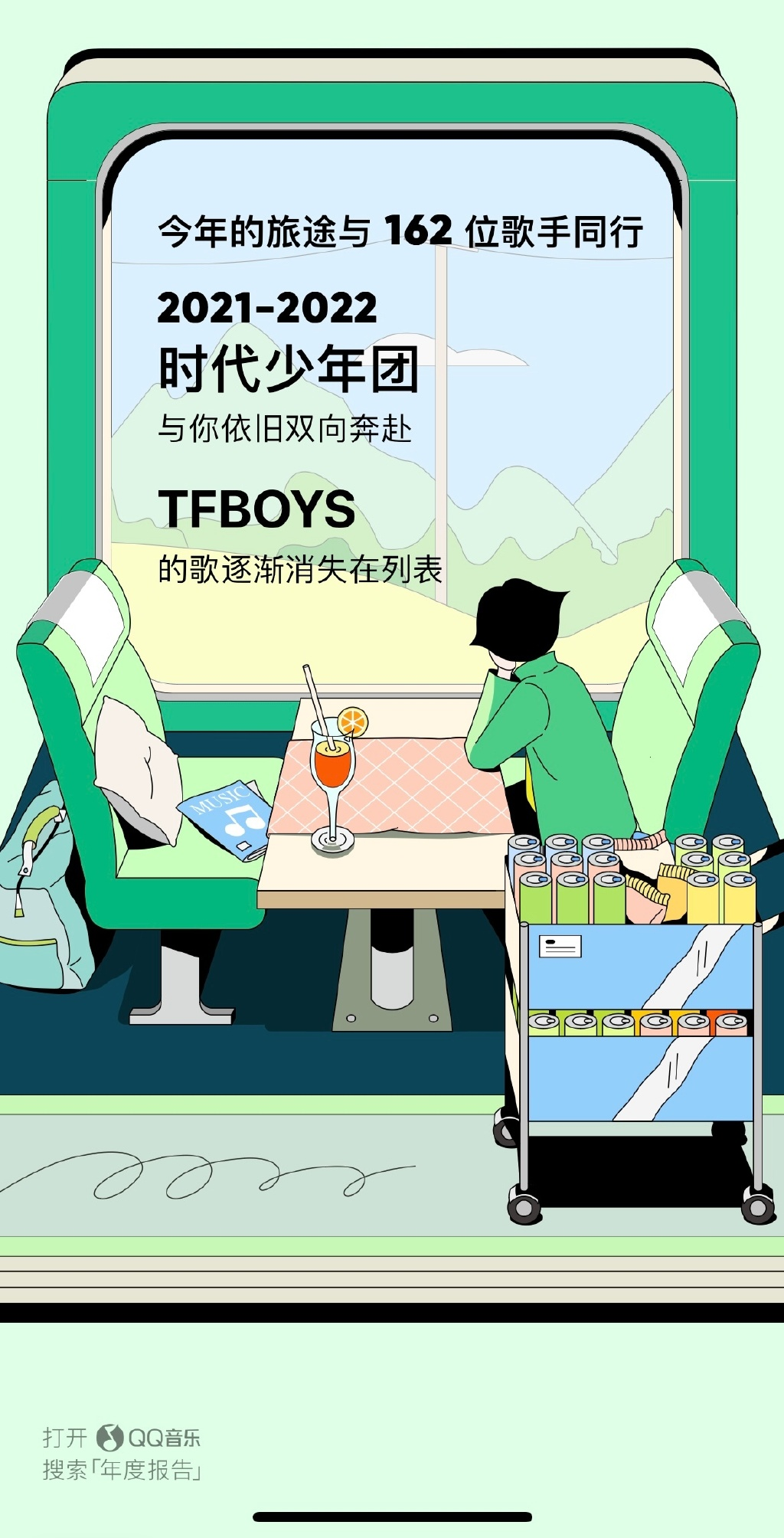 音乐类:主要参赛选手包括网易云音乐、QQ音乐、酷狗音乐等。今年是网易云音乐第七年推出听歌报告。QQ音乐、酷狗音乐持续跟进,音乐类APP展示的内容大同小异,涵盖全年听歌的曲目数量、已经累计的时长、歌曲年代分布、深夜还在听的歌曲、单曲循环最多的歌曲。而QQ音乐作为年度听歌报告的后来者,今年的亮点是生成音乐“旅途列车”,在美妙的音乐声中带着用户乘着虚拟列车,回归自己一年的听歌旅程。由于形式新颖,QQ音乐今年的年度报告享受了巨大流量红利,#QQ音乐年度听歌报告#话题在微博上阅读次数和讨论人数是2.5亿次、23万人次,一度登上微博热搜。