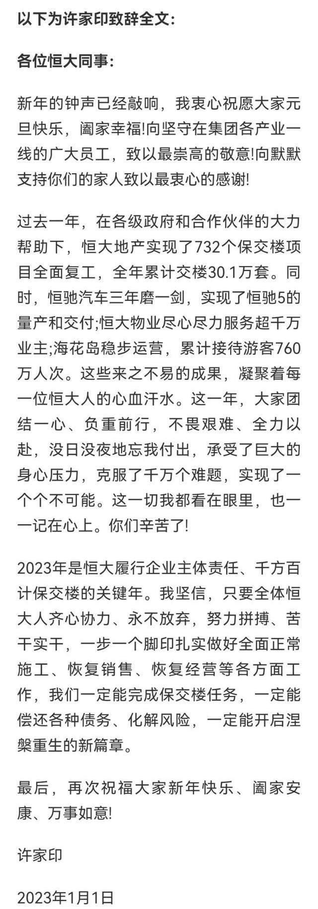 尽管在新年到来之际,许老板依旧按照惯例在内部发表了全员公开信,但字里行间已经不复过去的豪言壮语,更多的则是对早日化解债务危机的期盼。