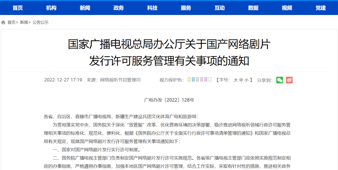 几天前,国家广播电视总局办公厅发布《关于国产网络剧片发行许可服务管理有关事项的通知》(简称:《通知》),明确对国产网络剧片发行实行许可制度,由国务院广播电视主管部门负责制定国产网络剧片发行许可实施规范,不断完善国产网络剧片事前事中事后全链条监管,根据互联网规律特点和网络剧片管理工作实际,采取分级监管、重点监管、动态监管、主体监管相结合的策略,实施有针对性、差异化、精准化的管理措施。