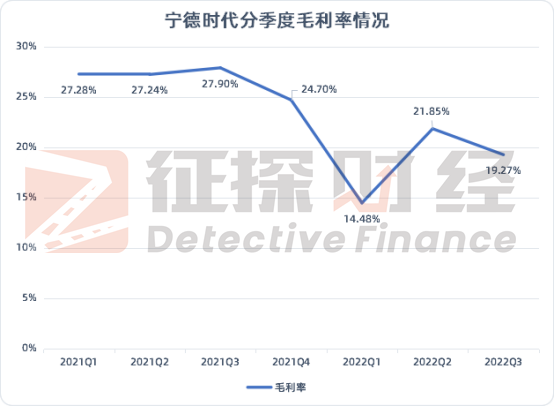 值得一提的是,尽管业绩快速上涨,宁德时代的盈利能力却在下滑。财报数据显示,2022年前三季度,宁德时代的综合毛利率分别为14.48%、21.85%、19.27%,较2021年同期都有所下降。