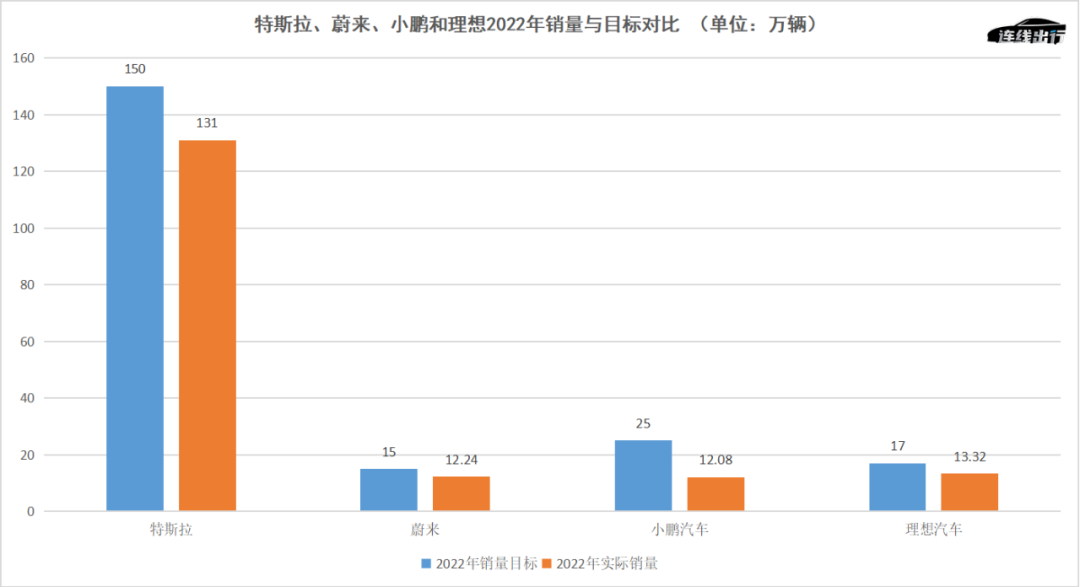 特斯拉、蔚来、小鹏和理想2022年销量与目标对比,数据来源于公开数据,连线出行制图