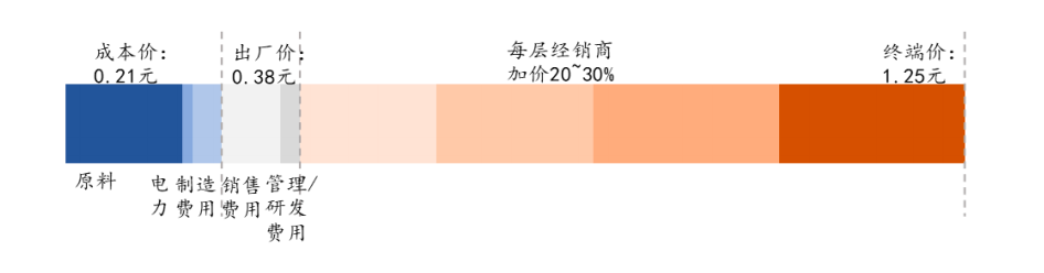 但行业的净利率水平却不高,包括恒安国际在内,头部厂商的净利率在8%-20%之间。消失的利润里,大半都被渠道商瓜分干净,每层经销商加价率高达20%-30%,终端零售价是出厂价的三倍多。