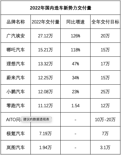 根据最新数据显示,2022年,蔚来汽车累计交付量为12.25万辆,同比增长34%,但全年业绩完成度仅为82%;理想汽车累计交付量为13.32万辆,同比增速达47%,按下调后的目标计算,业绩完成度也只有为78%;小鹏汽车累计交付量为12.08万辆,同比增长23%,业绩完成度更不足一半。