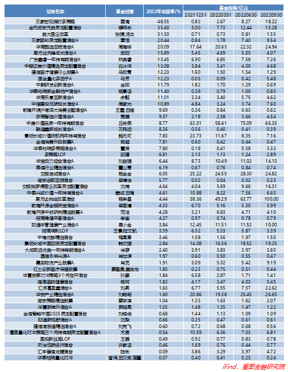 前两名均被万家基金黄海包揽,第三名则花落金元顺安基金缪玮彬。基金规模方面,斩获正收益或排名靠前的基金多数不足20亿元,属于“小而美”的产品。