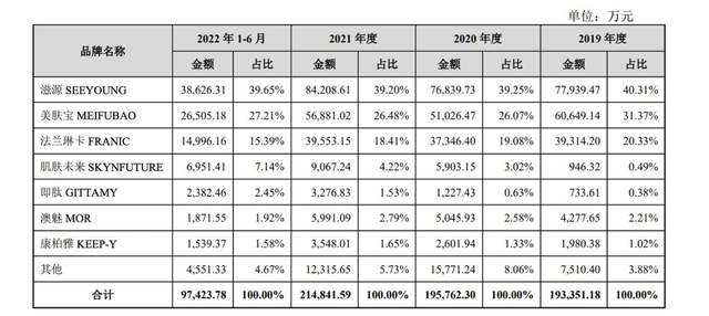 据招股书,环亚科技旗下的三个主要品牌是护发品牌滋源、护肤及防晒品牌美肤宝、护肤品牌法兰琳卡。2022上半年,三个品牌的收入占公司总营收的比重分别为39.65%、27.21%、15.39%。