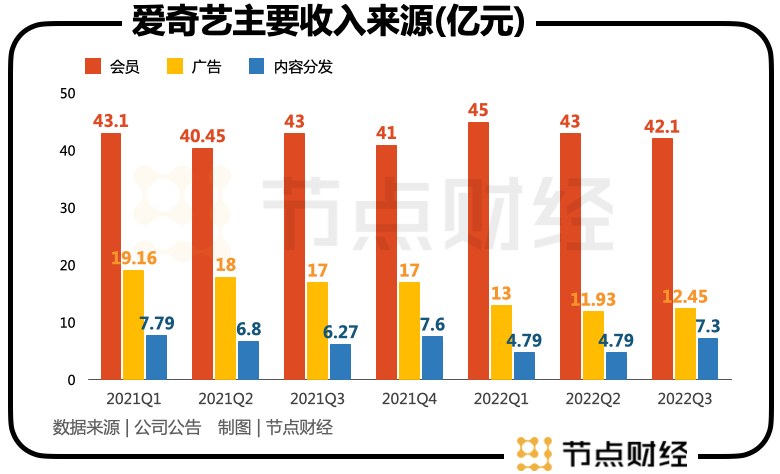 会员业务收入的提高,帮助爱奇艺对冲了正在下滑的广告业务。2021年12月,爱奇艺的会员价格上涨了约9%~20%,2022年一季度的会员收入达到了45亿元,这个成绩超过了2021年的任何一个季度。