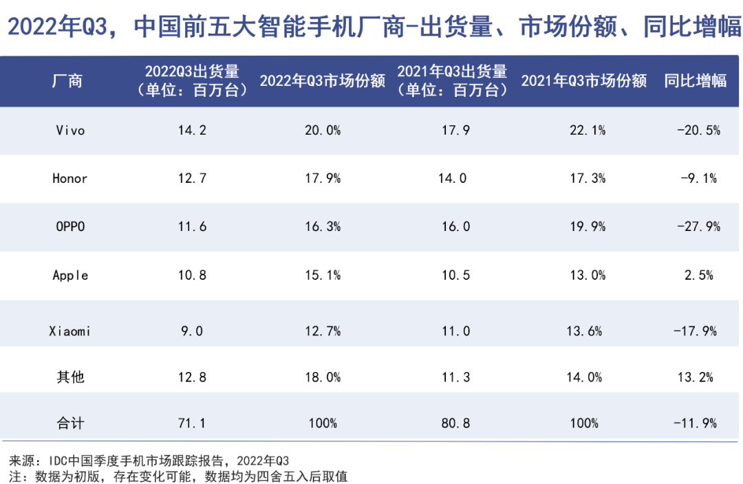 行业蛋糕变小了,而消费者更偏向高端耐用的产品,苹果每代产品价格基本过万,但仍旧可以卖出高溢价,而且卖得更好。2022第三季度,苹果是前五大手机厂商中唯一逆势增长的品牌,在中国手机市场份额提升至15.1%。