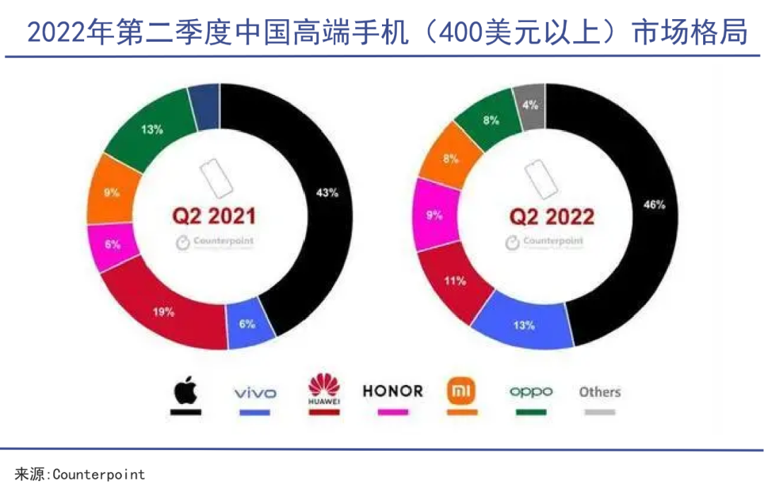 市研机构Counterpoint的数据显示,二季度中国高端智能手机市场(400美元及以上)中,苹果以46%的份额遥遥领先,此后分别是vivo、华为、荣耀、小米和OPPO。